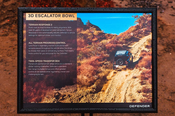 He chuckled and shared that we were not even close. “See through” cameras show you the ground right in front and underneath the front bumper, while the hill descent control takes over on steep downhill sections. As in, take your feet off both pedals and let the Defender handle itself.