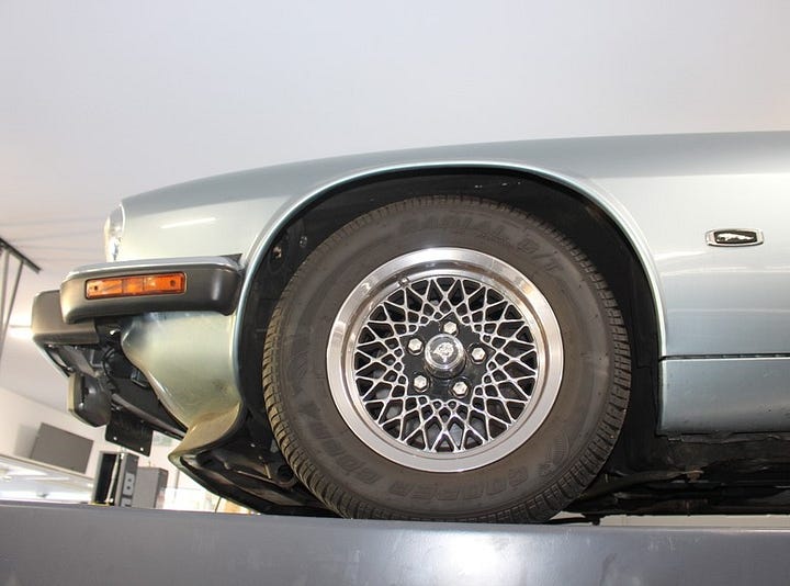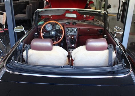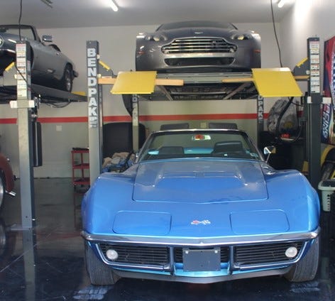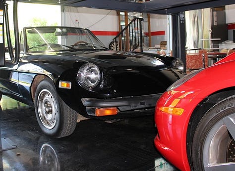 Next door sits a 1987 XJ and beyond that, a sharp 2007 Aston Vantage with a 6-speed-stick. Moving underneath, there’s a red C7 fronted by handsome 1986 Alfa that just begs, “Let’s go for a cruise…”.