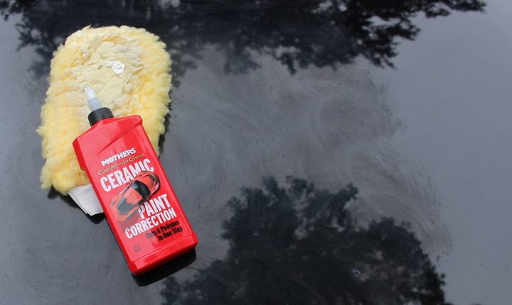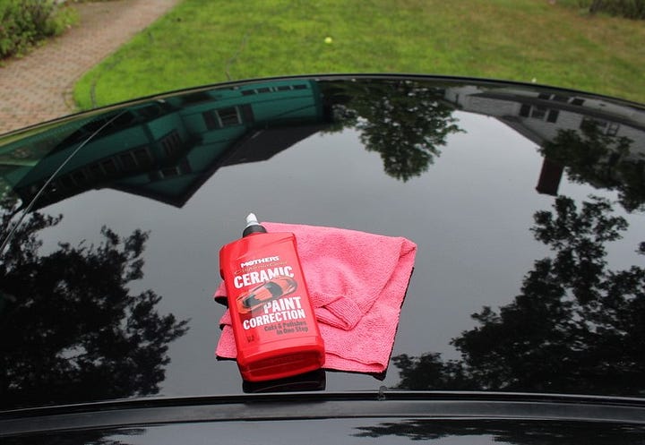After a thorough dry, or so I thought, it was wax-on, wax-off time. But first, a decision. The back of the Mother’s Ceramic Wash & Box bottle says to follow up with the Ceramic Spray Wax bottle of goo. But the bottle of Ceramic Paint Correction in my possession said the same thing. After much hemming and hawing, I decided to start with the paint corrector as both products seemed to point to the spray-on stuff as the final step. Per Mother’s, this paint correction paste “removes scratches and swirls while restoring gloss,” and I’m here to report that’s basically spot on.