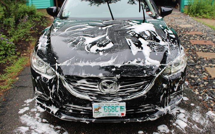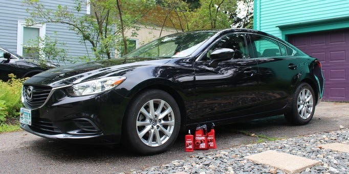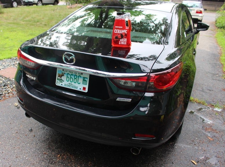 You see, my Mazda has been living outside the garage of late. The struggle, it is real. So was the level of filth. Particularly upon learning I would be “forced” to give it a deep cleansing using the California Gold Ceramic Line of soapy goods from Mother. Specifically, I left the poor 6 outside for many days full of trees dropping sap (you should see what the 400-year-old European Beech in my neighbor’s yard can unload) and birds dropping turds. (There is a bald eagle that flies overhead with regularity).