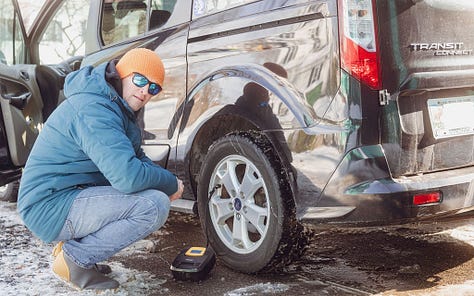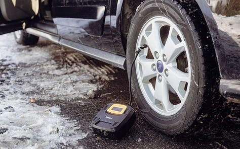 With the frigid air temperatures that make for good skiing come car tires that like to lose a bit of pressure here and there. Maybe your TPMS light illuminates in warning. Or, like with the Transit Connect that has no monitoring system, one of those tires just looks a little low. When this happens in your driveway, it’s annoying, but likely an easy remedy. However, when a tire gets low as you gear up to head home from skiing, it might be a bigger hassle.