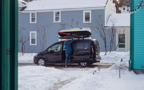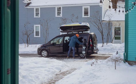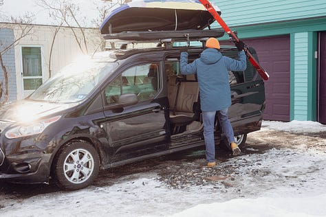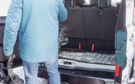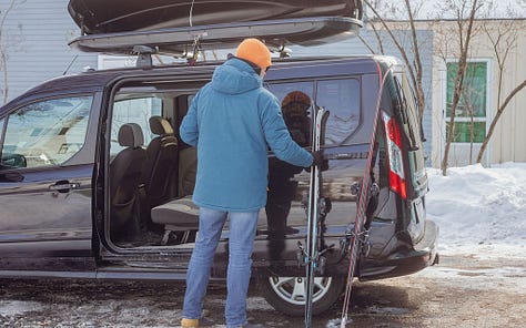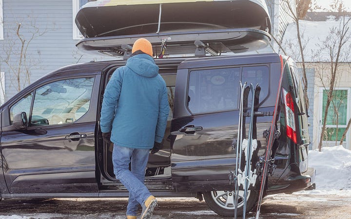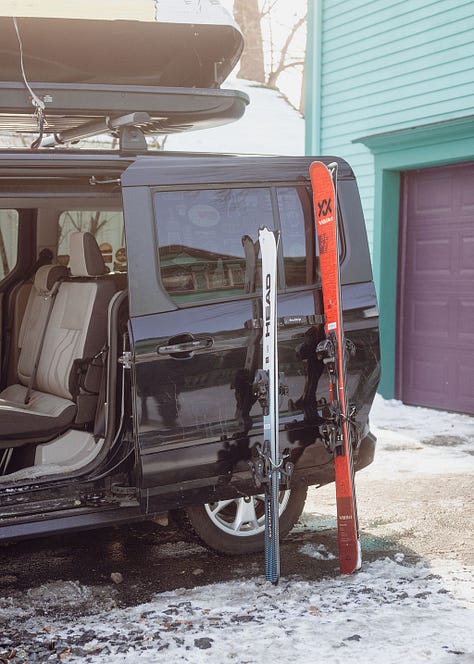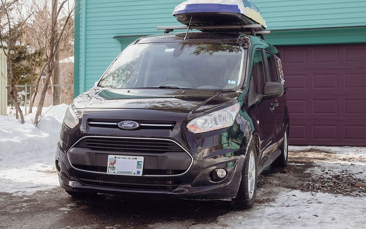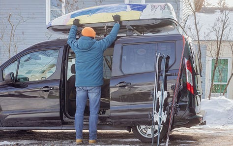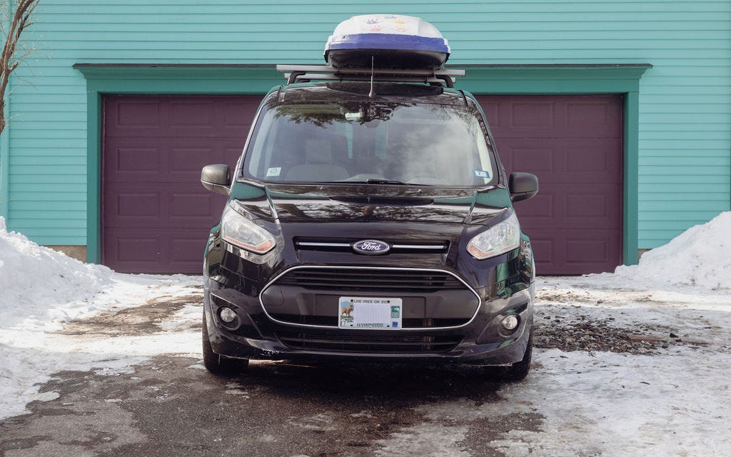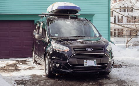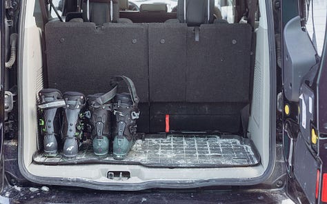 Based on marketing efforts and ski slope parking lots, you might think that a big SUV is the perfect family ski vehicle. But you would be wrong. As evidence, I present the Ford Transit Connect minivan. It’s narrow outside, huge inside, and - when properly outfitted - absolutely kills it on the family ski vehicle front.