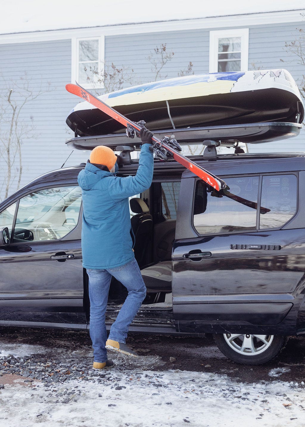 I have customized our Thule cargo box with a cutting-edge foam pool noodle racking system. Two noodles, spread about 3 feet apart, span the interior. Into each tube of foam are cut 5 narrow troughs to cradle our skis. It’s an impressive bit of engineering that you can inspect in the video above. #humblebrag. Plus, once I load the ski gear at the beginning of the season, it lives up there. The cargo carrier is lockable, so no need to constantly load and unload the skis after each trip to the slopes. I highly recommend one for all your skiing needs.