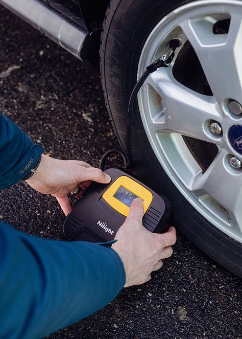 The nearest gas station could be a hike, and maybe you’re not comfortable driving the whole family home with tires in need of some love. Which is where the Nilight portable inflator comes in. Nilight sent me a unit to review, and I’m happy to report that it works like a champ. Power comes from a 12V cabin outlet and does not require the car be running. The nearly 11-foot-long power cable means you can reach all 4 corners. A digital touchscreen gives you the current pressure reading and can be set to a target PSI - then automatically shut off when said pressure is reached.